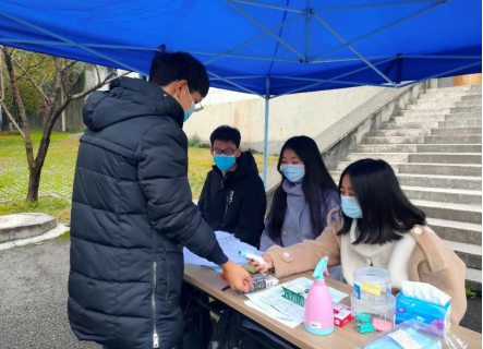 我院学生返校报道点设在学院门前,通过测量体温、酒精消毒等环节后,值班学生对同学递交的《学生返校登记表》进行了核查。