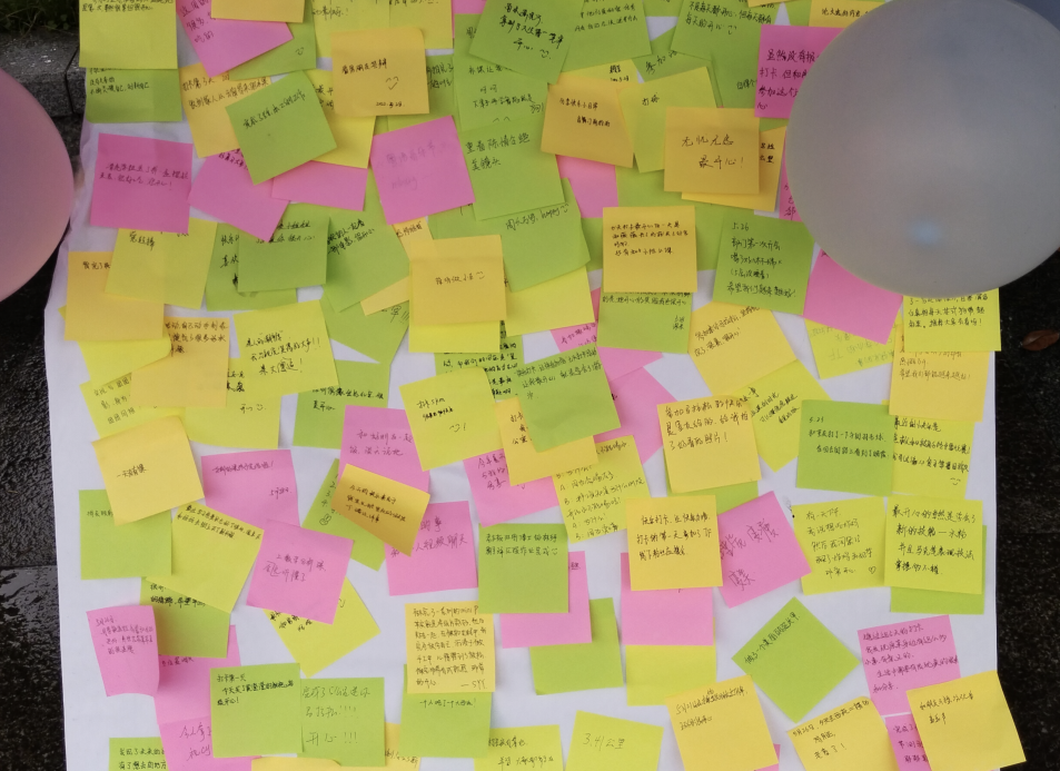 本次活动采用线上线下两种方式举行。5月21日到5月28日,同学们通过线上空间连续七天打卡,来分享快乐的生活日常。随后在5月28日,同学们纷纷前往大学生广场参与线下活动,他们先从报名登记处领取便签纸,写下七天打卡中最令自己开心的事并张贴。紧接着,同学们需要参与两个小游戏,其中,画笑脸的游戏中,每位参与者在纸上画下三个笑脸,让快乐在一个个笑脸中传递。