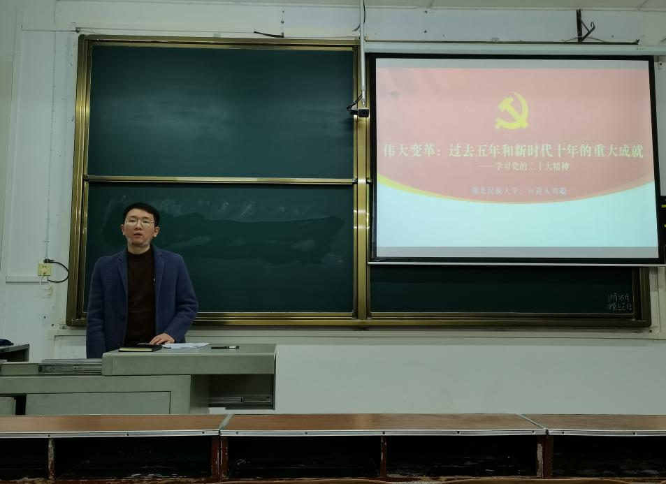 宣讲会伊始,刘老师就党的二十大精神宣讲的目标、纪律、意义作出说明。紧接着,刘老师从“两个许多”、“四个面对”两个方面对中国过去五年的伟大实践作出系统性阐述。