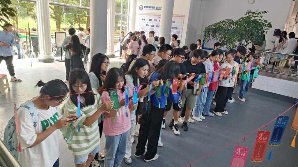 本网讯(记者 朱显雯 钟颖鑫 邹乐/文 朱显雯 钟颖鑫/摄)丹桂飘香,中秋已至,又是一年月圆节,为让同学们在学院感受到中秋的欢乐气氛,9月27日,我院院学生会在数学与统计学院一楼大厅开展以“喜迎中秋,情系数统”为主题的中秋节活动。
