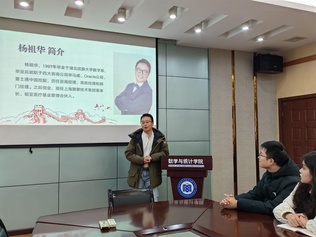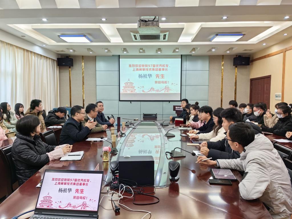 为促进校友与母校的交流,分享校友的成长经历和人生感悟,为在校师生提供学术和职业发展的启示,加强校企合作。2023年12月13日,我院邀请1997届的优秀校友杨祖华先生回到母校,为学生们带来了一场励志盛宴。出席本次活动的有学院党总支书记赵魁轩,党总支副书记郑敏,学生科副科长黄丽娜,数学系主任向中义以及2021级数学与应用数学专业全体学生。