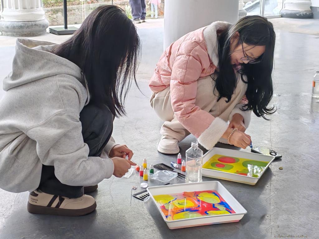 3月13日,“丝韵织梦,巾帼创艺”手工制作活动在学院大厅开展。学生分组领取白色素面丝巾和无毒颜料等工具材料,运用绘画、印染、扎染等技法制作出各具特色的作品,通过传统文化与现代创意的完美融合,将不同彩线编织成一幅春日油画。