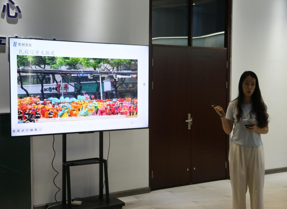 李子君老师首先阐述了活动主旨:紧扣铸牢中华民族共同体意识主线,致力于增进各民族学生间的联系、促进文化交融。随后,七名来自两学院的各民族学生代表依次登台,他们以生动的语言和精美的图片,从服饰、节日、饮食、景点等多个维度,全方位展现了本民族特色和家乡独特魅力:新疆和田约特干古城的历史底蕴、哈萨克族“三个玉兹”的文化传承、新疆抓饭与西藏酥油茶的味觉记忆;以及穿青人“跳菩萨”“灰粽子”等独特民俗,一幅幅绚丽多彩的民族文化画卷在师生面前徐徐展开。