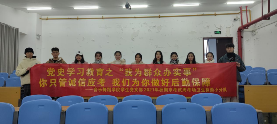 2021年临近尾声,为深化党史学习教育成果,在秋季期末考试周之际,音乐舞蹈学院学生党支部成立卫生执勤小分队,对学院各个教室进行卫生打扫,为全院考试工作做好做牢后勤保障,通过实际行动为群众办实事。