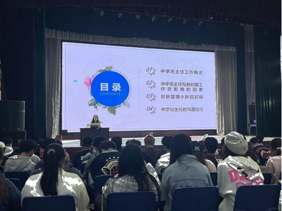 文迪从“中学班主任工作概述”、“中学班主任在新时期工作受影响的因素”、“创新管理小妙招初探”和“中学班主任的沟通技巧”四个方面结合实际案例给同学们进行了生动有趣的讲授。