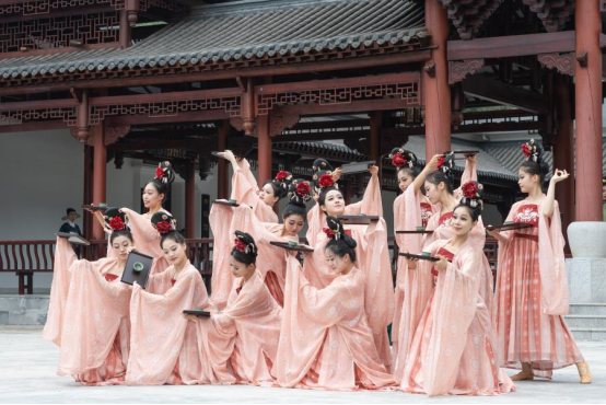 歌舞诗表演《典籍里的恩施茶》用古今茶人对话的形式,以恩施茶史为线索,融茶艺、茶歌、茶舞、茶诗、茶剧等艺术为一体,呈现恩施茶文化的发展历史脉络,为观众带来沉浸式文化体验。现场设有六个茶席,每个茶席都对应不同的茶史故事,序章《武王伐纣,巴人贡茶》演绎土司夫妇与民大学生的跨时空相遇,将恩施茶史娓娓道来;第一篇章《巴峡问茶,陆羽著经》讲述唐天宝年间茶圣陆羽为著《茶经》,重走三国张揖之路并在“尹公羹”的基础上开创“陆氏茶”的故事;第二篇章《茶道大行,唐煎宋点》表演者用温婉柔美的舞姿演绎出盛唐茶宴的情景,煮茶、煎茶、点茶,动作行云流水,向观众介绍了“施州八香”饼茶及“施州研膏茶”,彰显恩施茶的多元多样;第三篇章《明清瀹茶,看我容美》剑舞吟唱《茶墅》诗叩开明清茶史之门,女子群舞《采茶歌》一窥明清时期恩施土司地区茶史发展之缩影;第四篇章《宜红功夫,飘洋过海》通过演唱叙事长诗《售红茶》,对宜红茶的品质、制作、筛选、品评、拼配、包装等环节进行介绍;后记《东湖茶叙,一红一绿》将恩施玉露、利川红两种硒茶拟人化,用旗袍秀的形式呈现茶仙子手捧香茗,欢迎客人到访的场面。
