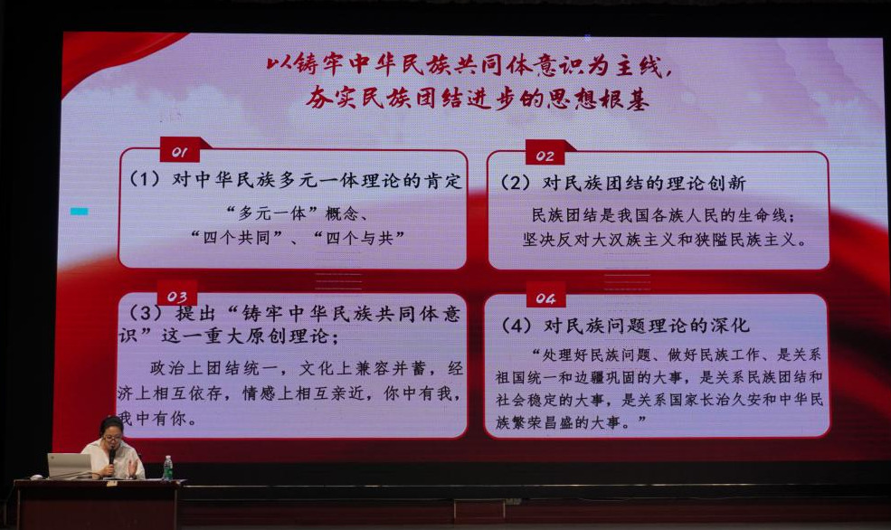 为进一步加强铸牢中华民族共同体意识的宣传教育,音乐舞蹈学院于9月11日下午在学院演播厅组织开展《石榴花开 民族团结》主题入学教育讲座,本次讲座由音乐舞蹈学院党总支副书记邓丽主讲,音乐舞蹈学院2024级全体新生参加。