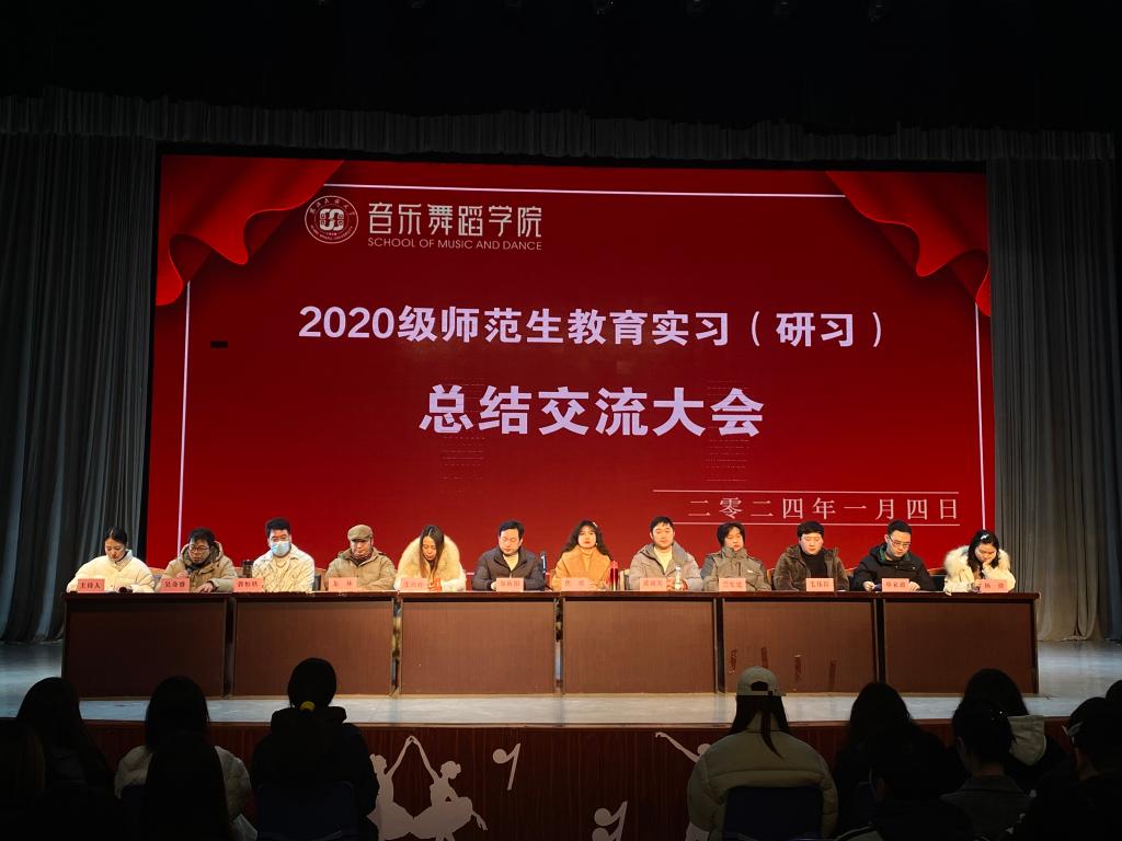 2024年1月4日晚,音乐舞蹈学院2020级师范生教育实习(研习)总结大会在音乐舞蹈学院演播厅顺利召开,音乐舞蹈学院院长谷秋阳、副院长焦娜,各系部、科室负责人、教研室主任,20级音乐学、舞蹈学班主任及全体师范生参加会议。