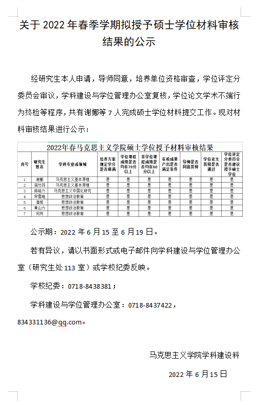 关于2022年春季学期拟授予硕士学位材料审核结果的公示