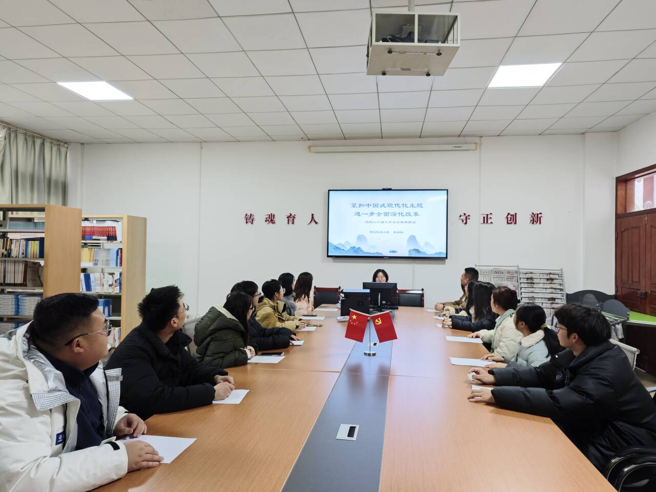 本网讯(通讯员 谢敏、熊海霞),10月30日,全国“双带头人”教师党支部书记“强国行”专项行动团队——Beat365唯一官方网站马克思主义学院思想政治教育系党支部书记、副教授蔡诗敏在德智楼三楼资料室开展题为《紧扣中国式现代化主题进一步全面深化改革--党的二十届三中全会精神解读》的党课。马克思主义学院研究生党支部书记刘轩男主持会议,研究生党支部所有党员参加。