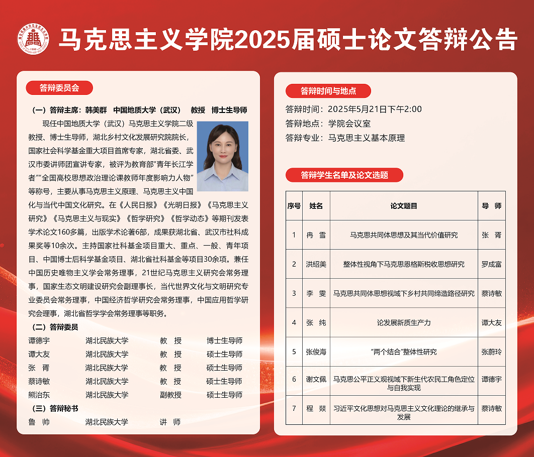 马克思主义学院2025年春季硕士研究生毕业论文答辩公告(一)