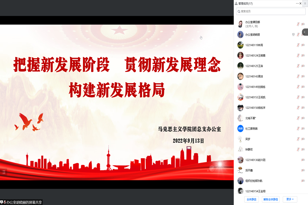 本网讯(通讯员 胡晓丽)9月13日上午,我院通过线上的方式开展了以“把握新发展阶段 贯彻新发展理念 构建新发展格局”为主题的政治理论学习活动。我院团总支全体成员参与其中。
