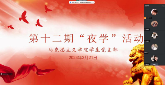 2月21日,我院学生党支部通过线上腾讯会议开展第十二期党员夜学活动。马克思主义学院学生党支部全体党员参与此次学习,本次学习由学生党员赵珈萱领学。