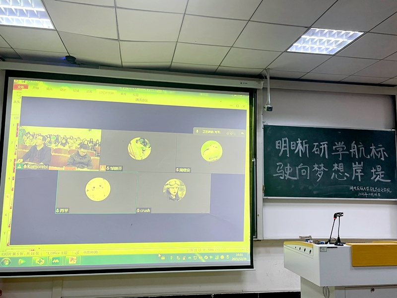 随后,我院优秀毕业生中国人民大学在读博士肖平、华中师范大学毕业生周信安、武汉理工大学在读硕士邹丽芬、湖北大学在读硕士向美晴通过视频连线分享考研心得。其中,肖平指出考研可以提供更高的就业平台、有利于开拓视野、扩展人脉;关于考研难度的问题,她认为坚持和心态是取胜的关键,要坚定目标,勇往直前。邹丽芬就择校和备考经验两方面做详细阐述,在择校方面,她认为要考虑到城市和个人的实际状况等因素;备考方面,她从自身的经历出发分享英语和专业课复习经验和技巧,希望每一个学生都能潜心学习,奔赴梦想的彼岸。