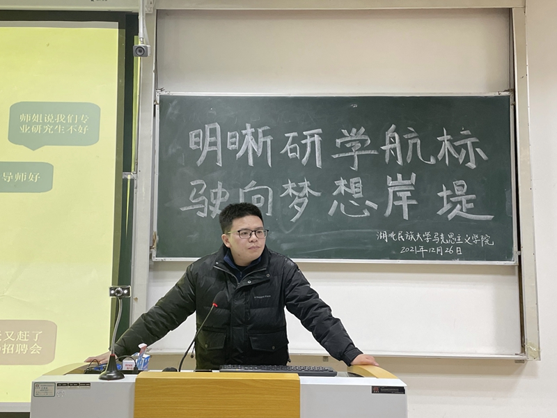 本网讯(通讯员 查婷/文 赵淑凡/图)为调动我院学生考研积极性,12月26日晚,我院在德智楼9B210教室成功举办以“明晰研学航标,驶向梦想岸堤”为主题的考研动员大会,我院博士、硕士生导师鲁帅受邀担任主讲人,党总支副书记张明波、团总支书记毛召应邀出席,全体大三学生参加此次活动。
