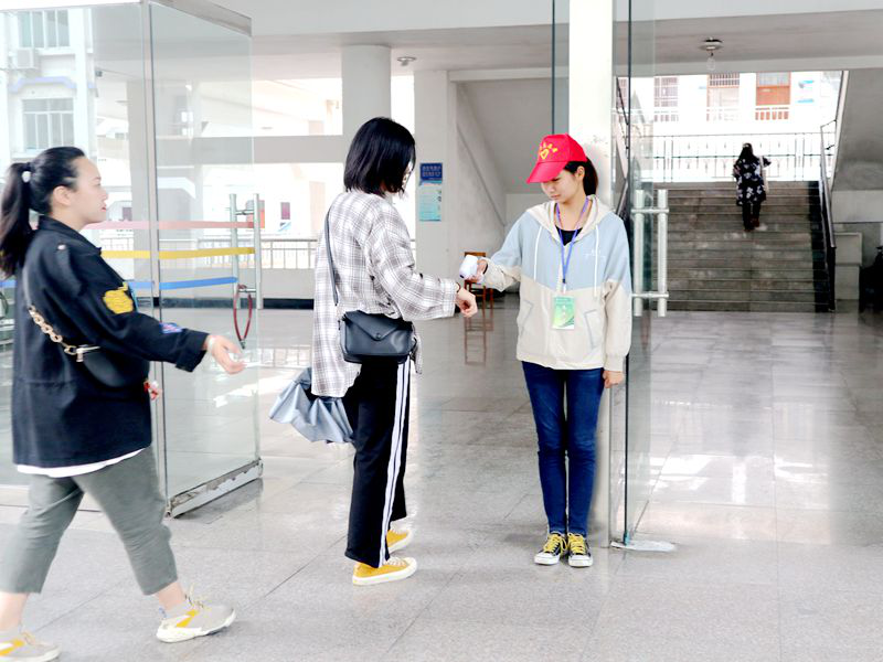 活动期间,志愿者于周一至周五在德智楼正门和侧门分别实行上、下午轮班制,对来往人员进行体温检测。若在值班过程中,发现人员发热情况,将上报学院负责人。