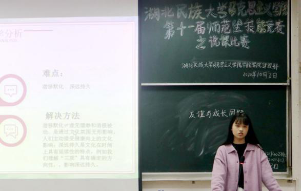 此次比赛包括教案设计、模拟授课和即席演讲三个部分。模拟授课环节,三号选手王蒋龙舟重点从思维纠偏和误区警示两方面对《意识的本质》展开讲述,通过易错题分析,有效的与学生进模拟交流;即席演讲环节,五号选手訾薇薇针对当今全球疫情的形势,结合自身经历生动讲述中国抗疫故事,表达她对抗疫过程中涌现出的人民英雄崇高的敬仰和赞美。