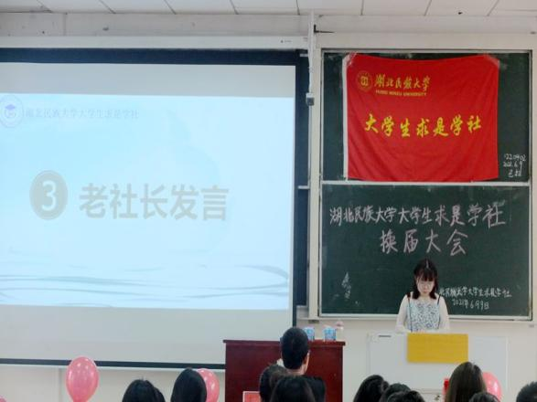 大会伊始,新任社长胡小亿发言,他认为在社团发展的过程中人心齐则泰山移,他希望新一届社团干部能凝心聚力,致力于社团的发展。新干部发言。他们根据自身特点,结合部门工作,均希望社团能在他们的工作下继续创优。前任社长发言。王春花表示能成为社长她十分的荣幸,在过去两年的时光里,求是学社给她留下美好的回忆,她希望在未来社团能够取得更好更长足的发展。老干部发言。吴荣华从自己在求是学社一年的工作经历出发,总结自己的经验教训,她认为在社团中每个成员都应该认真工作,充分发挥主人翁精神。