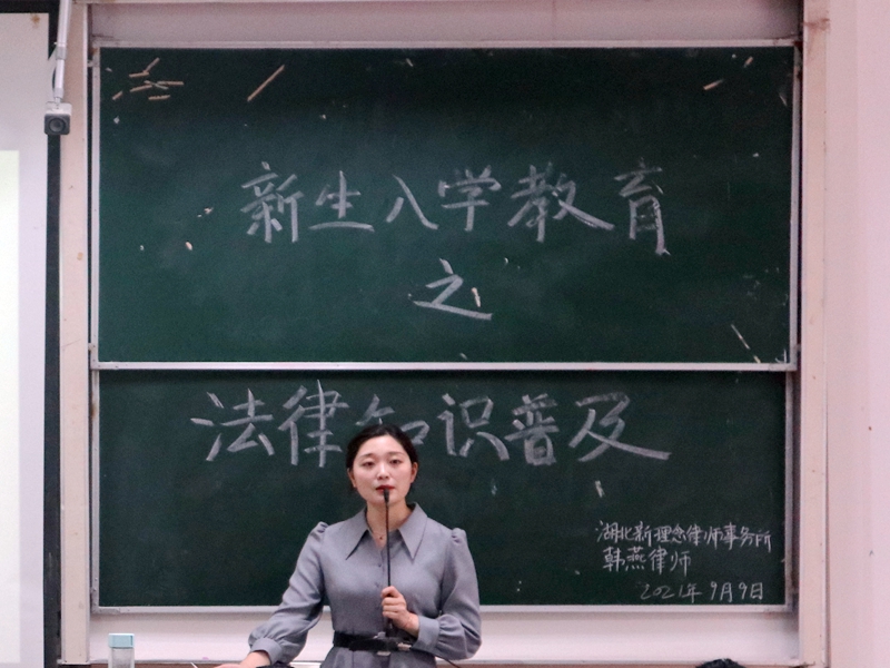 本网讯(通讯员 刘梦/文 华典典/图)9月9日上午,我院在德智楼9B203教室开展以“法律知识普及”为主题的新生入学教育活动,湖北新理念律师事务所韩燕律师受邀出席并担任主讲人,全体大一新生参加此次活动。