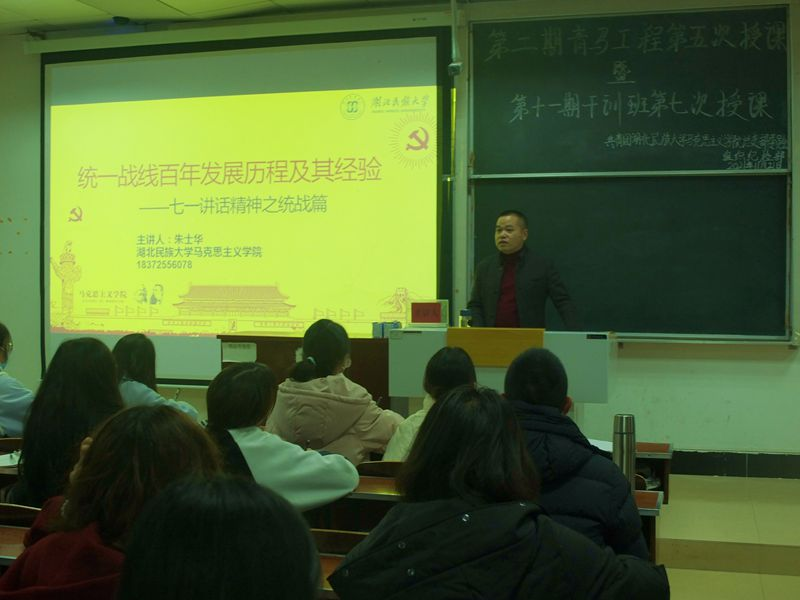 本网讯(通讯员田金爽 见习通讯员 王晓霞 胡晓丽/文 吴丁鑫 胡晓丽/图 )11月21日晚,我院在德智楼9B210教室开展以“统一战线百年发展历程及其经验——‘七一’讲话精神之统战篇”为主题的第二期“青年马克思主义者培养工程”第五次授课暨第十一期学生干部综合素质培训班第七次授课,我院教师朱士华应邀出席并担任主讲人。