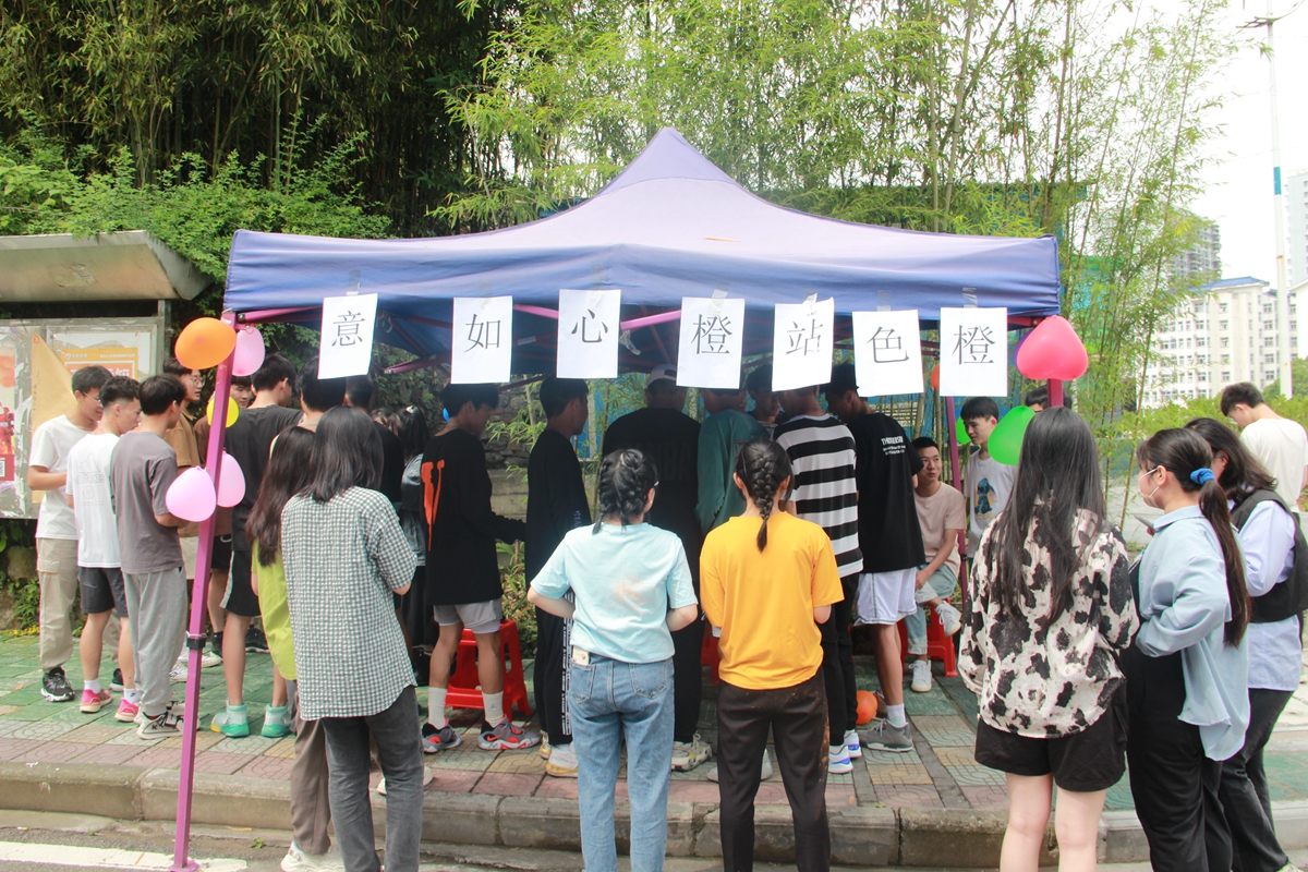 活动伊始,学生在民族体育场集合并领取集章卡,由智能学院心理健康工作室成员举行放气球剪彩仪式,学生在横幅上签名留作纪念。接着主持人宣布活动开始。期间,学生依次在民族体育场蓝色站、修远楼红色站、北苑橙色站、美术与设计学院黄色站、桂园广场绿色站、小球馆青色站、生科院紫色站、西苑生活超市白色站、大学生广场彩色站九个颜色站点进行你猜我画、一反常态、猜字谜和正话反说等游戏,参与学生在每站获得相应的站点章,集齐八个即为任务完成。我院橙色站点设置在北苑餐厅,名为“橙心如意”,它结合专业特色,运用新颖的游戏形式吸引众多参与者围观和挑战。整个游戏过程,工作人员向参与者提供特制彩跑粉,学生通过这种方式有效释放压力。