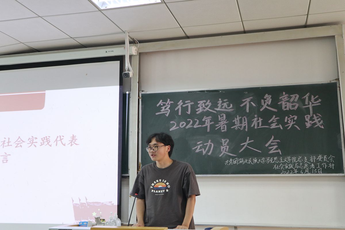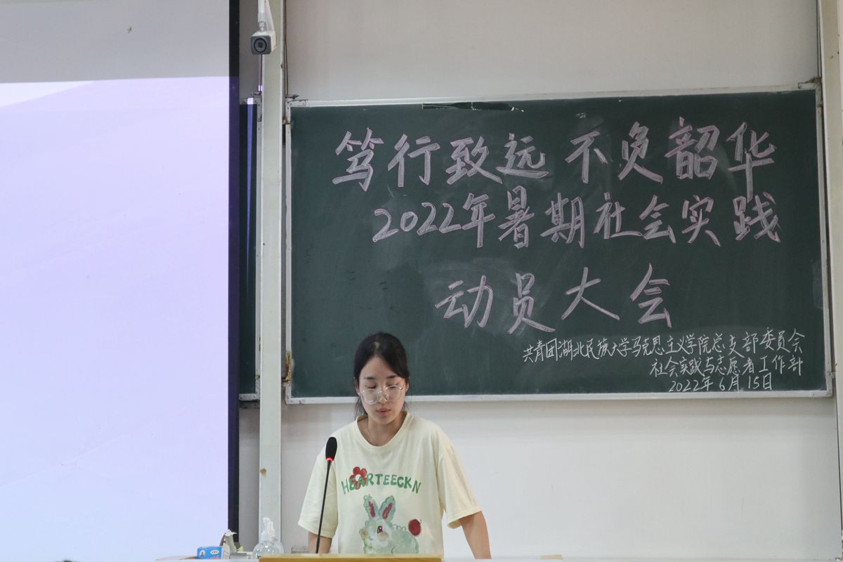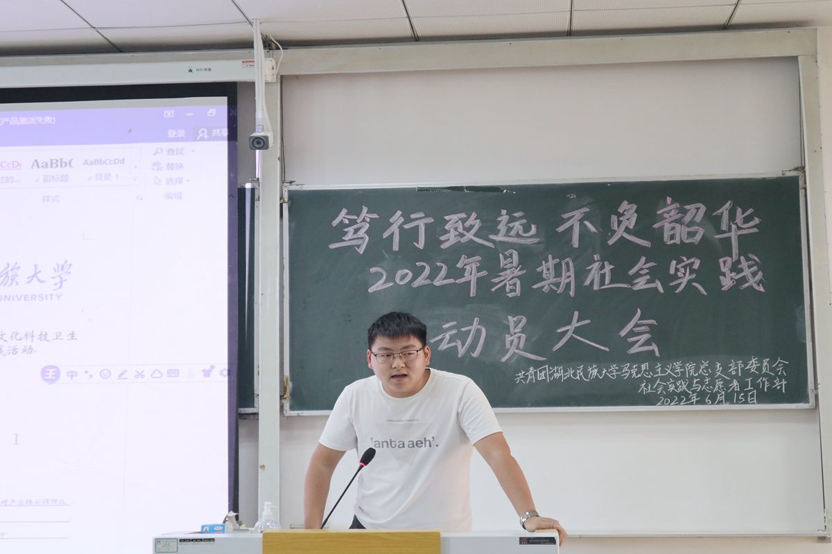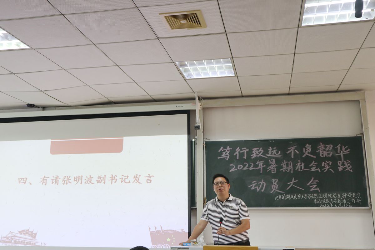 本网讯(通讯员 成楠/文 黄丽兰/图)6月15日下午,我院在德智楼9B208教室举办以“笃行致远,不负韶华”为主题的2022年暑期社会实践动员大会。我院党总支副书记张明波、团总支书记毛召应邀出席。我院全体大一、大二学生参与此次活动。