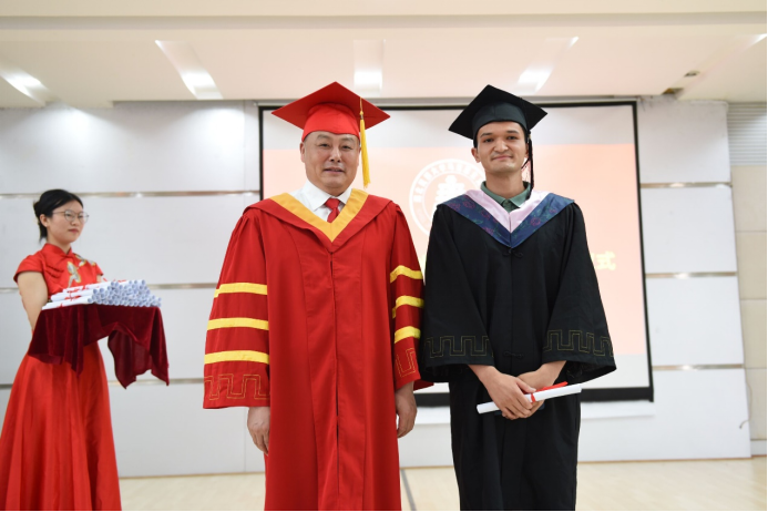 典礼在庄严的国歌声中拉开帷幕。暖场环节,毕业生们接力合唱《凤凰花开的路口》并向辛勤耕耘的老师们献花,感谢老师们的教导和培养,一句“老师,我们毕业啦!您辛苦了”道出了思政学子最真挚的心声。随后,徐铜柱院长为毕业生拨正流苏,颁授学位,握手祝福并与他们一一合影留念。紧接着,张胥副院长为优秀毕业生颁发荣誉证书,谭大友老师为校友联络员颁发聘书。优秀毕业生代表张韶奇发言。他表示自己一定铭记“博学博爱,立人达人”的校训,发扬“艰苦奋斗、自强不息、甘于奉献、追求卓越”的民大精神,不忘初心,牢记使命,在各自领域勇攀高峰,努力为民大代言。