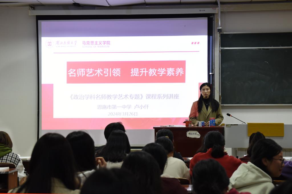 本次讲座邀请恩施市第一中学政治教师卢小仟进行授课。卢小仟以“高中政治课议题式教学设计的理论与实践”为主题,分析了议题的性质特征和构成要素。她指出高中思想政治课议题式教学是新课程标准提出的承载活动型学科课程的一种新式教学方法,应当充分发挥议题式教学的议题性、情境性与活动性的特点,有计划、有目的地开展符合教学内容与学生认知水平的议题式课程。随后,卢小仟通过典型案例分析,为同学们生动呈现议题在思想政治教学中的应用,并阐释了如何选择和确定教学议题、细分议题设计教学、创设教学情境以及设计探究问题,将学科知识以立体、灵动、鲜活的面孔呈予学生。