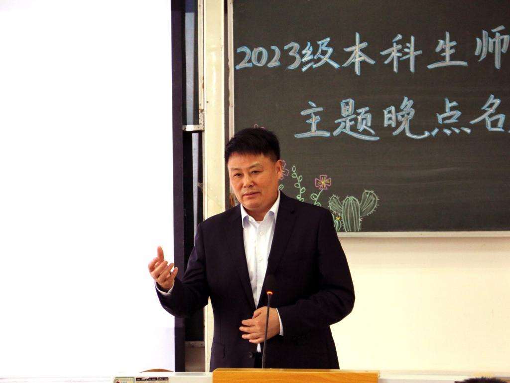 徐铜柱致辞。徐铜柱指出举办师范生技能提升主题晚点名是马克思主义学院提升师范生的实践能力和综合素质的创新举措,能够帮助师范生更清晰地认识师范专业人才培养方向,明确师范专业内在的素养目标,满足今后学生综合能力发展的现实需要,有目的、有策略地提升教育教学能力,为学生未来教育工作打下坚实的基础。