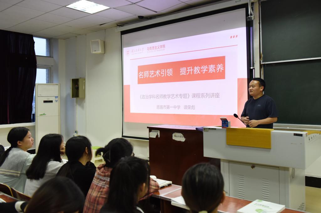 4月16日,我院在德智楼9B210教室开展以“名师艺术引领 提升教学素养”为主题的《政治学科名师教学艺术专题》课程第四场讲座。学院邀请了恩施市第一中学政治教师谭荣彪进行授课,我院党政办公室主任崔蕤主持,2021级全体学生聆听讲座。
