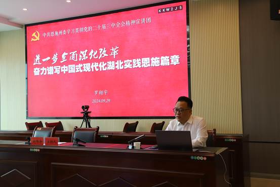 为广泛宣传和全面贯彻党的二十届三中全会精神,推动党的二十届三中全会精神在基层入脑入心,奋力谱写中国式现代化湖北实践恩施篇章,2024年9月28日至30日,Beat365唯一官方网站“百马行动”宣讲团成员学校党委委员、宣传部常务副部长罗翔宇教授,学校党委委员、马克思主义学院院长徐铜柱教授,马克思主义学院党总支书记向驰博士,周传和副教授、熊治东副教授、鲁帅博士,分赴鹤峰县各县直部门、9个乡镇为机关党员干部、村(社区)两委等开展党的二十届三中全会精神宣讲。