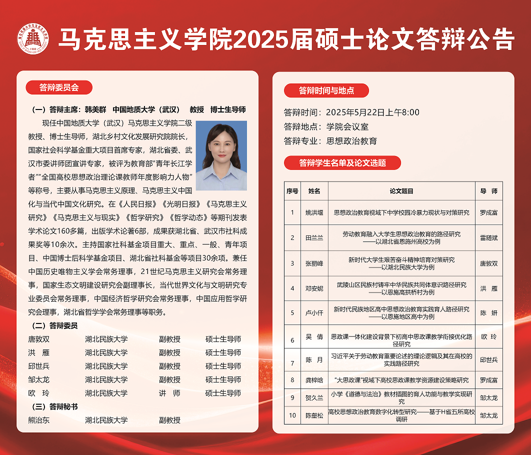 马克思主义学院2025年春季硕士研究生毕业论文答辩公告(四)