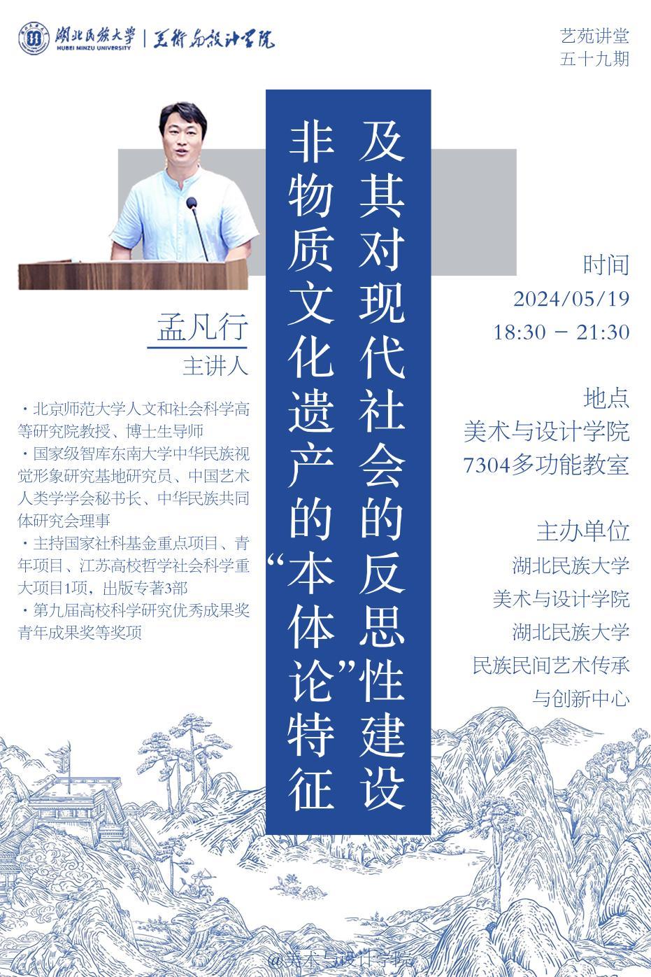 2024年5月19日晚北京师范大学人文和社会科学高等研究院非物质文化遗产研究与发展中心博士生导师孟凡行教授,应邀在7304多功能智慧教室作题为“非物质文化遗产的‘本体论’特征及其对现代社会的反思性建设”的学术讲座,院长石庆秘教授主持,我院及其他学院部分师生参与此次讲座。