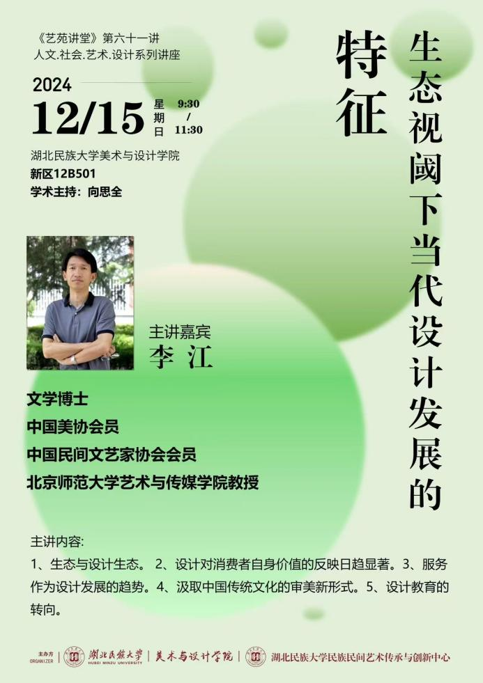12月15日上午,北京师范大学艺术与传媒学院文学博士、中国美协会员、中国民间文艺家协会会员李江教授,应邀在我院12B501多功能会议室举办了一场题为“生态视阈下当代设计发展的特征”的学术讲座。本次讲座由院长石庆秘教授主持,吸引了我院及其他学院的部分师生积极参与。