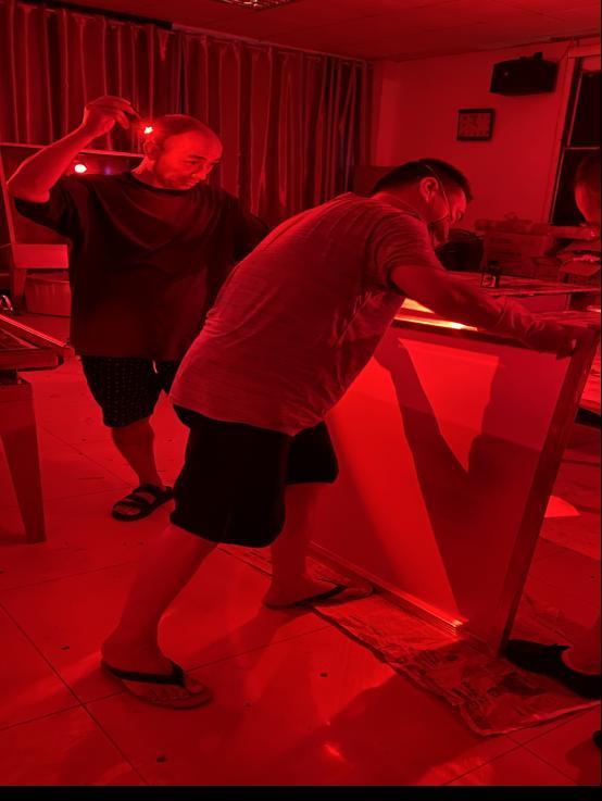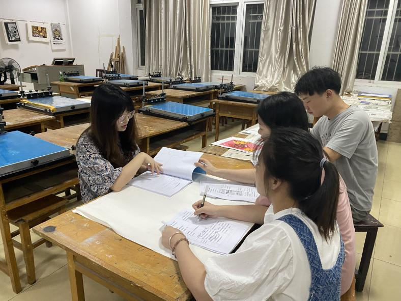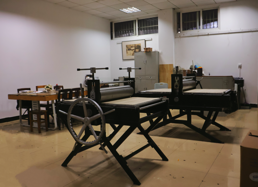 版画工作室以“创作带动教学” 为核心理念,聚焦本科版画专业教学与艺术创作研究,致力于培养“能创作、会教学、懂教研” 的复合型人才。工作室现拥有数百平方米专业创作空间,设有实训教室和丝网版暗房。实训教室配备专业版画设备(如曝光机、小型油印机等),墙面陈列学生课堂习作。学生在此系统研习黑白木刻,从基础刀法训练逐步过渡到主题创作。丝网版暗房有独立避光空间内设有感光制版台、晒版灯与洗版池,可完成从分色菲林制作到丝网印刷的全流程操作,为学生提供专业的现代版画创作环境。