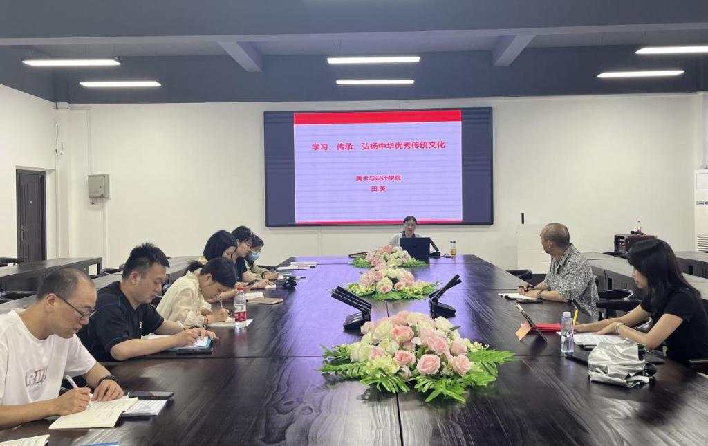 田英以中华优秀传统文化经典语句和习近平总书记对中华传统文化的解读为切入点,从“中华优秀传统文化的内涵与精髓”“中华优秀传统文化的当代价值”“中华优秀传统文化的传承与弘扬”三个方面对中华优秀传统文化进行了阐述,要求学院党员干部认真学习贯彻习近平总书记在文化传承发展座谈会的重要讲话精神,结合学院实际,发挥美术与设计学科、专业优势,积极参与传承、弘扬中华优秀传统文化,铸牢中华民族共同体意识。
