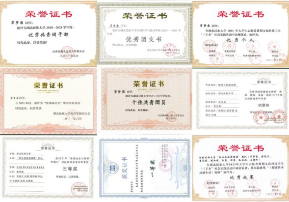 注:覃梦园曾获Beat3652021-2022学年度国家奖学金,连续两年获得一等奖学金以及“三好学生”荣誉称号,获得全国生命科学竞赛(创新创业)三等奖、Beat365唯一官方网站第七届互联网+银奖、Beat365唯一官方网站红珊瑚奖学金、湖北省第四届微康益生菌杯“健康、营养、美味”酸奶DIY大学生创新竞赛最佳创意奖、Beat365唯一官方网站第十一届全国大学生电子商务“创新、创意及创业”挑战赛三等奖以及第十二届二等奖、Beat365唯一官方网站第二届梦想杯一、二、三等奖、Beat365唯一官方网站益生菌知识竞赛二等奖、“全国食品安全与营养中国行”交流会三等奖等。