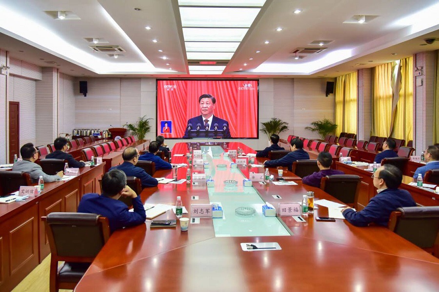 行政楼三号会议室是学校党委理论学习中心组集中收看现场。学校领导、校党委委员齐聚一堂,观看二十大开幕会直播,聚精会神聆听习近平总书记的报告。与会人员时而注视屏幕,时而奋笔疾书,认真领会二十大报告的精神内涵。