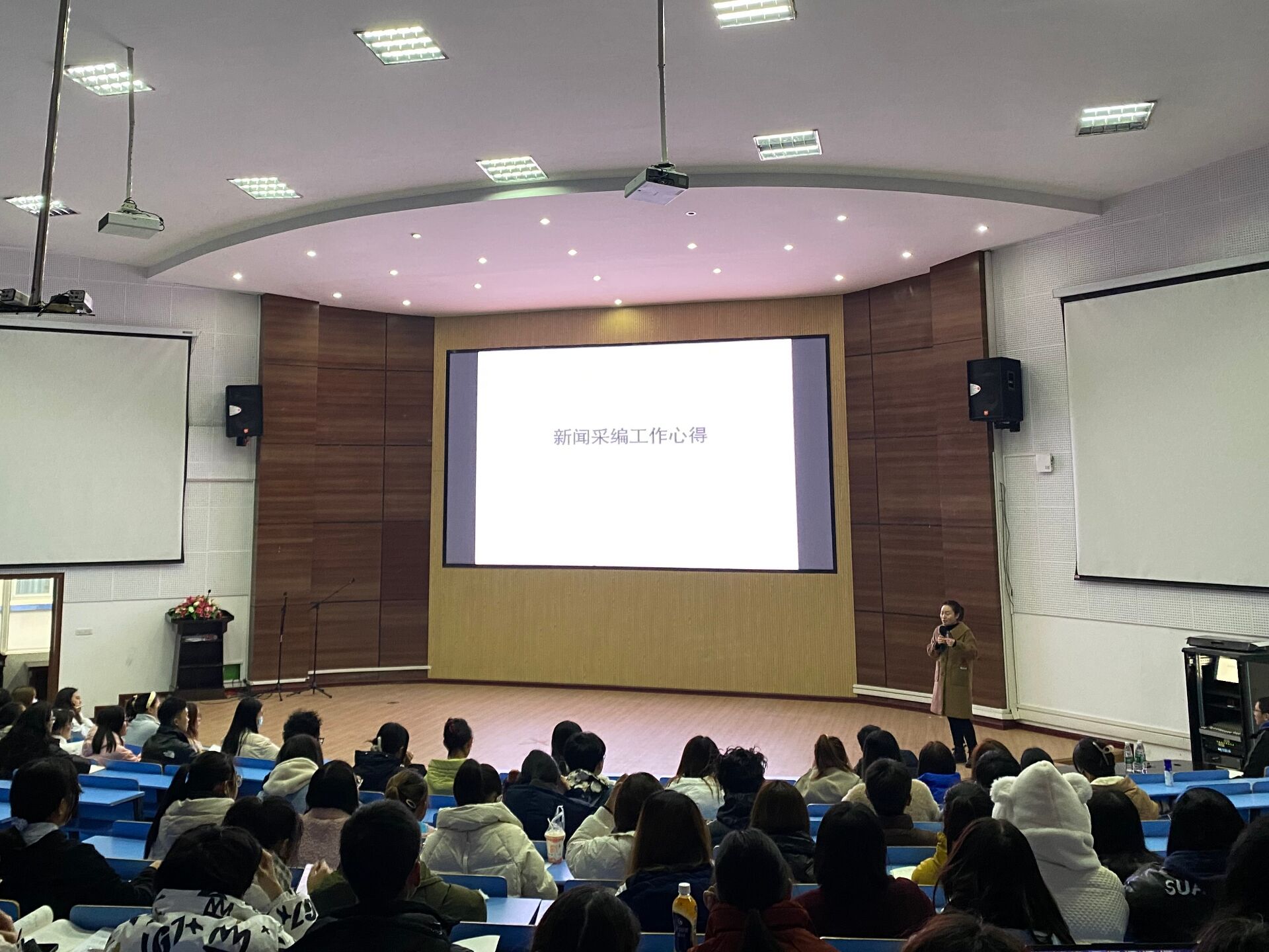 在培训中,主讲人廖希为结合自身专业知识与新闻采编的实战经验,从新闻采编、新闻摄影、人物通讯、新媒体推文四个部分展开讲授。现场学生干部笔不离手,聚精会神地听讲。
