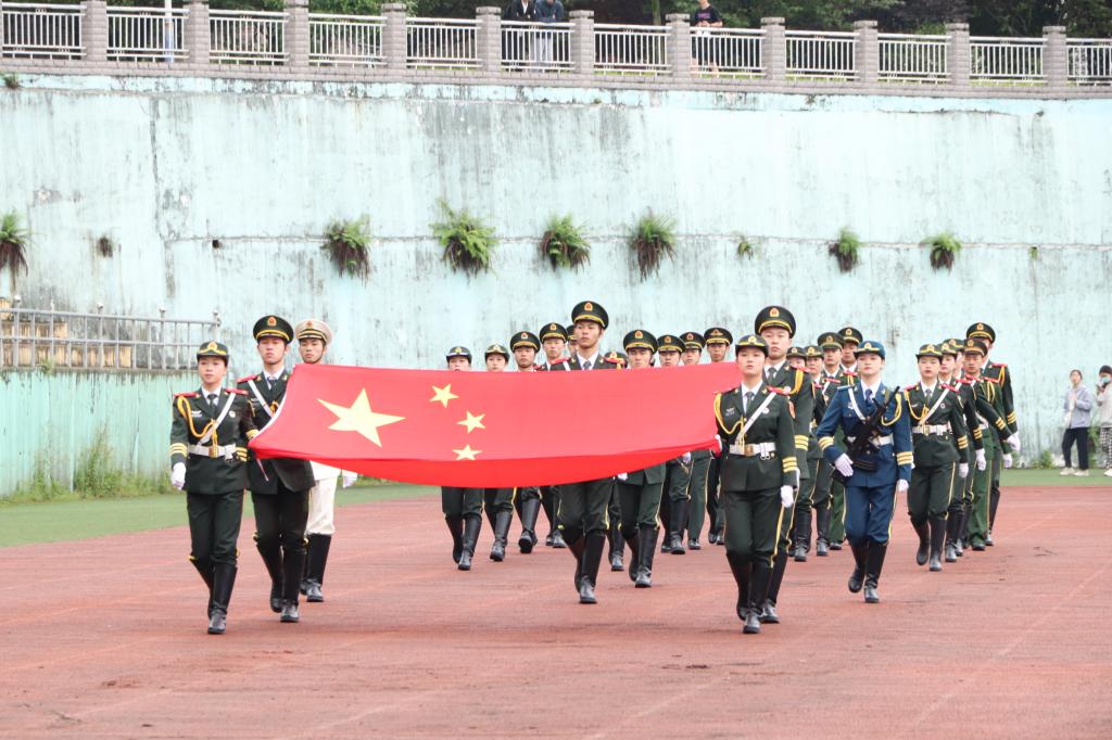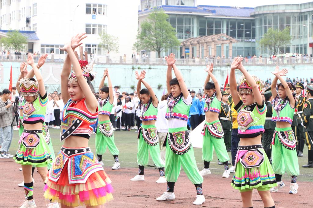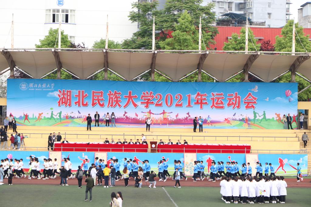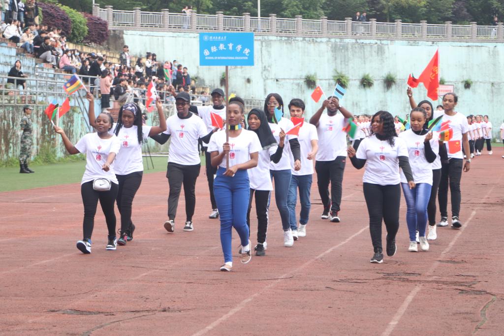 伴随着严肃激昂的运动员进行曲,国旗护卫队、医学部彩旗队及各二级学院代表队依次入场。国际教育学院手持不同国家国旗,展现出“运动无国界”的精神。法学院代表队师生共走方阵,挥舞小红旗体现出激扬的爱国情。此外,体育学院的运动员们身着少数民族服装带来激情四射的民族舞蹈,赢得观众阵阵欢呼和掌声。