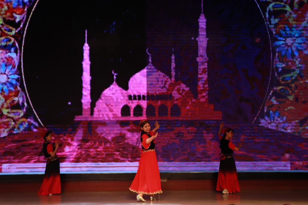 比赛涵盖民族舞蹈串烧、歌曲演唱、传统乐器吹奏、黄梅戏、现代舞蹈等多种形式。在充满异域风情的开场舞中活动拉开帷幕。维吾尔族的古丽努尔同本民族同学身着民族特色服饰载歌载舞,婀娜灵动,展现出少数民族特有的文化风情。