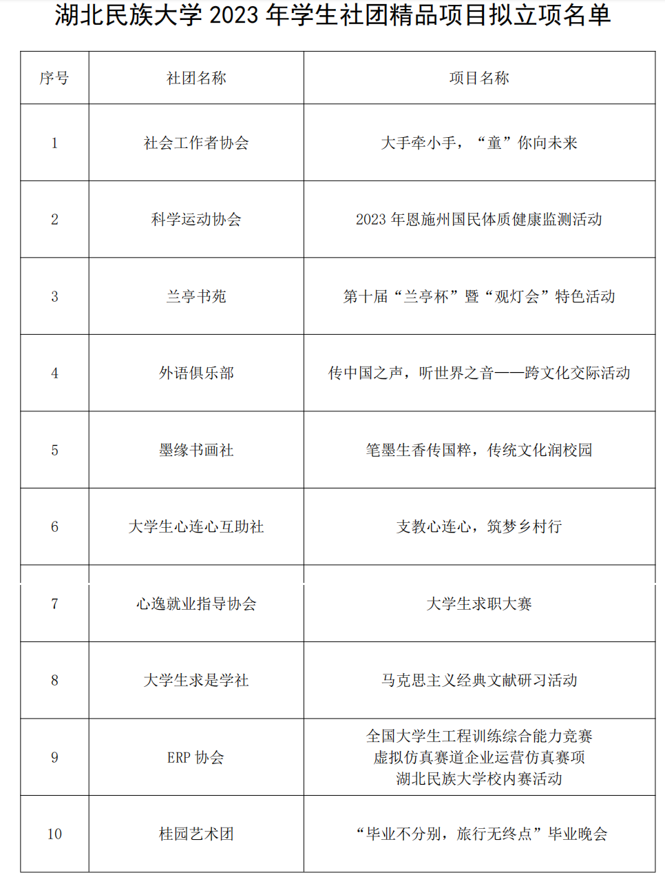 根据《关于申报Beat365唯一官方网站 2023 年学生社团精品项目的通知》要求,经社团申报、学院审核,校团委组织评审,最终确定社会工作者协会“大手牵小手,“童”你向未来”等 10 个社团项目为学生社团精品项目。现将拟立项名单予以公示,公示时间为 2023 年 4 月 4 日至 4 月 11 日。如对公示结果有异议,请在公示期内以实名附书面形式向校团委反映。