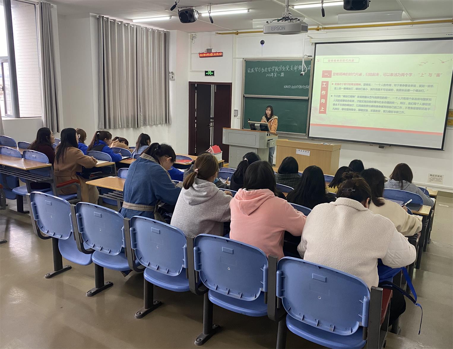 活动伊始,赵杨同志以“学习雷锋精神,争当文明先锋”为主题,结合即将到来的“学习雷锋日”,从雷锋同志的生平、雷锋精神的由来、雷锋精神的具体内容与内涵等四个方面详细解读了雷锋同志爱憎分明的阶级立场、言行一致的革命精神及奋不顾身的革命斗志。以此鼓励学生对雷锋精神的“向上”“向善”精神进行实践,并将其落实到学习、工作和生活上。