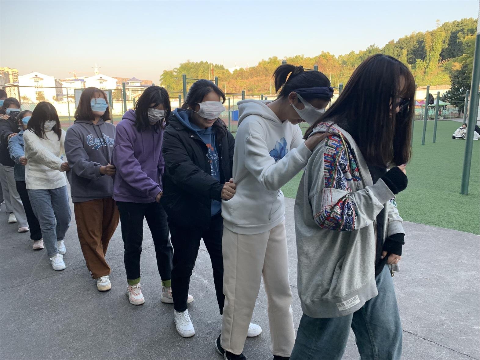 本次活动分为“健身操”“踩气球”“两人三足”“九宫格”和“盲人摸巷”五个环节。活动伊始,心理健康部部长吴六金带领全体学员进行热身运动。在“踩气球”环节,四队成员两两分组,以“两人三足”的形式进攻或保卫气球。“九宫格”环节中,全体学员以最快的速度将棋子连线,该游戏考验成员反应能力和团队意识。最后的“盲人摸巷”环节,工作人员从旁提示,参与者全程闭眼,在带领人的引导下齐心踏步,并肩同行,顺利通过预设的障碍路线,将活动气氛推向高潮,该游戏环节旨在指引学生干部要相互信任,树立团队意识,从集体中发掘自我潜力。