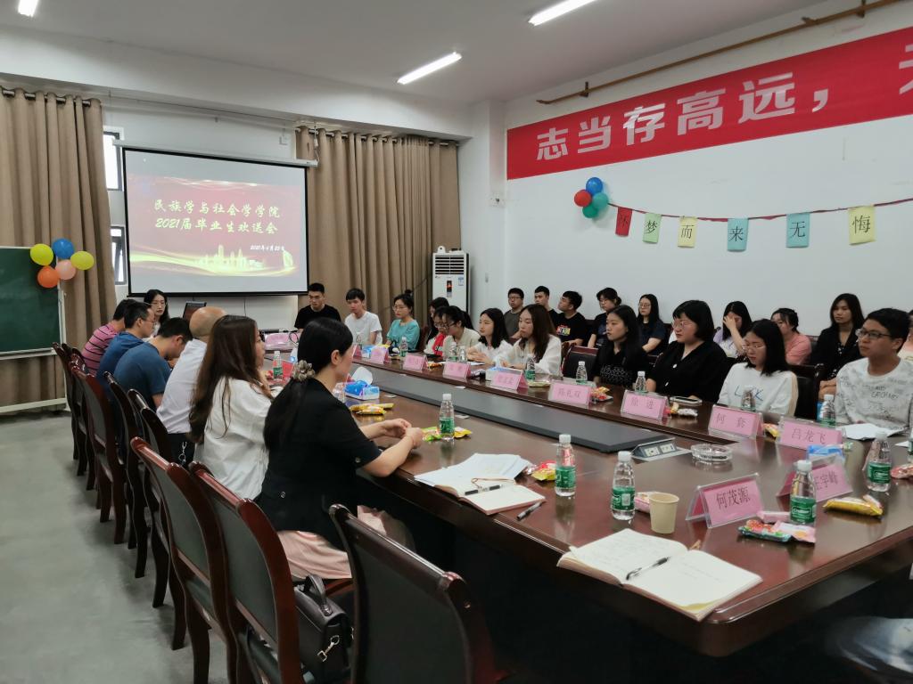 谭志满致辞。他代表学院全体教职员工向2021届毕业生表示衷心的祝贺和祝愿,希望他们永远是“社会人”,牢记专业使命,助人自助,博学博爱,立人达人;永怀感恩之心,将自己的所思、所学、所悟运用到实践中去,不忘初心,做顶天立地的“民大人”。