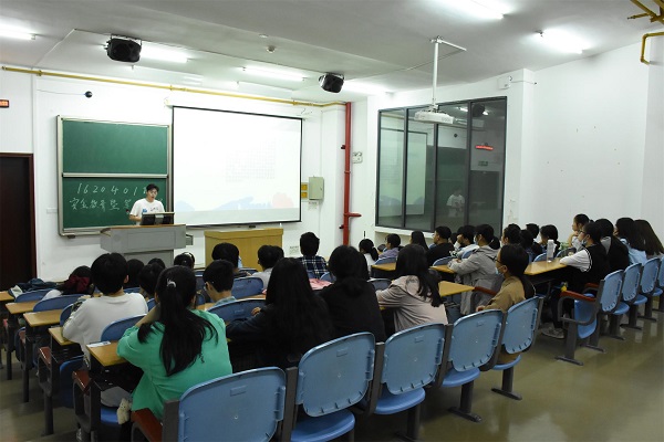 在5A502教室里,由学生周帅担任主讲人。本次活动分为两个环节,第一环节为防骗防疫安全教育;第二环节为军训动员大会。首先,周帅利用问题“你所了解的欺骗大学生的手段有哪些?”引出安全教育第一篇----防骗篇。他利用自己亲身经历去告诉在场学生当今网络骗局的手段,进而建议大一新生要谨防网络诈骗,同时还要理性消费,远离校园贷等一系列不正规借贷平台。之后便是第二篇----防疫篇。周帅结合当前防疫大趋势,给在场新生提出防疫的相关建议。他提到在学校大环境下,要注重保护自己,防范疫情。在5A505教室里,杜鹏老师从防骗、宿舍安全、心理健康三方面切入,阐述骗局套路,呼吁新生不要接触校园贷,并强调保持心理健康,希望新生遇到相关事情多与老师、同学交流。