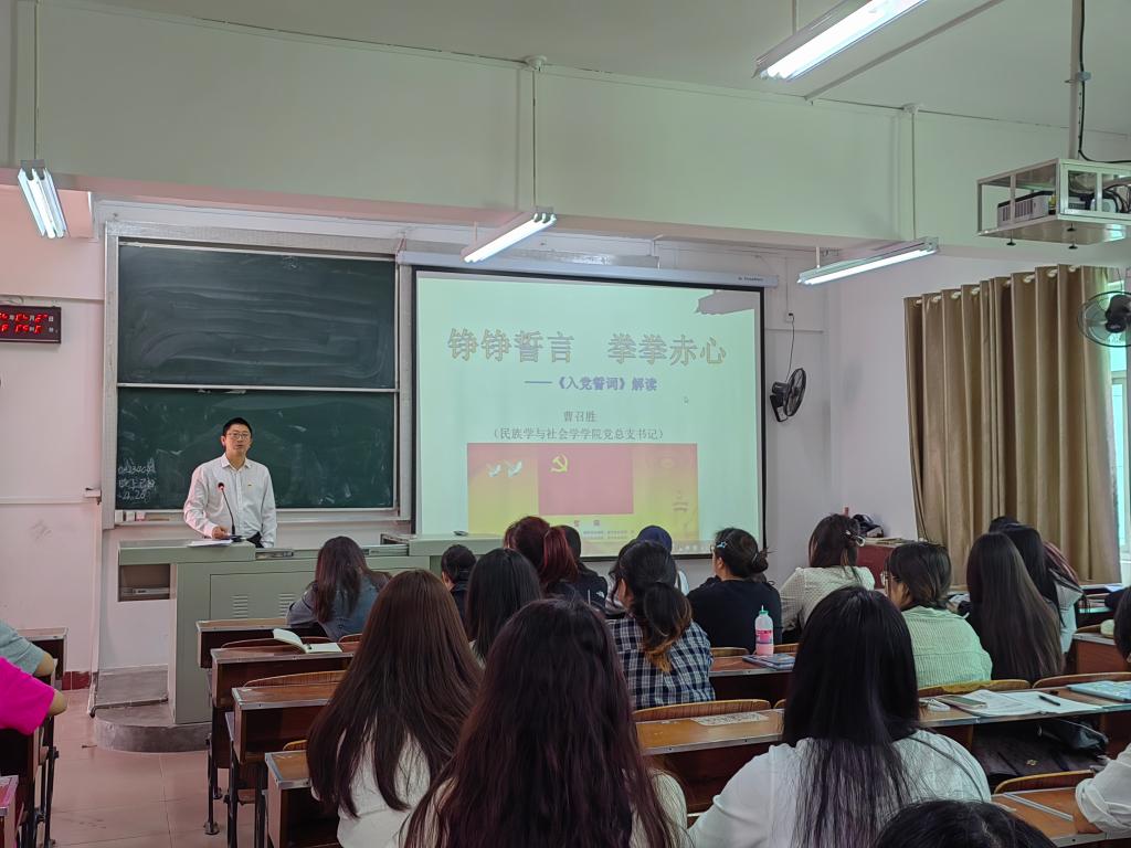 (通讯员叶佳琪)4月27日上午,民族学与社会学学院党总支书记曹召胜在外国语学院6B304教室为民族学与社会学学院、外国语学院等五个学院的党员发展对象讲授党课,本次授课主题为“铮铮誓言,拳拳赤心---入党誓词解读”。