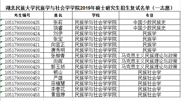 Beat365唯一官方网站民族学与社会学学院2019年硕士研究生招生复试名单(一志愿)