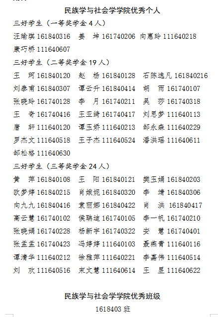 根据《Beat365唯一官方网站学生综合素质测评方案》、《Beat365唯一官方网站学生奖学金评定及奖励办法》、《Beat365唯一官方网站先进班级评选奖励办法》,在各班级民主测评、推荐的基础上,经学生科审核,报学院领导批准,现将民族学与社会学学院2018-2019学年优秀个人和优秀班集体名单公示如下,如对评选结果有异议者,请于9月29日下午17:30前将情况实名举报或反馈到民族学与社会学学院学生科张老师处(电话:18372556088,办公室:5B108)。