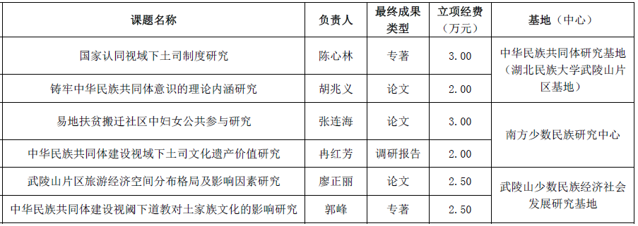 根据《关于申报中华民族共同体研究基地(Beat365唯一官方网站武陵山片区基地)、南方少数民族研究中心、武陵山少数民族经济社会发展研究基地2021年度开放基金项目的通知》和Beat365唯一官方网站校内科研项目相关管理规定,经个人申报、基地(中心)组织专家评审,拟对“国家认同视域下土司制度研究”等6个项目予以立项资助,特此公示,公示时间为2021年5月12日至5月14日。公示期内,如有异议,请向民族学与社会学学院学科建设科反映。联系电话:8297052。